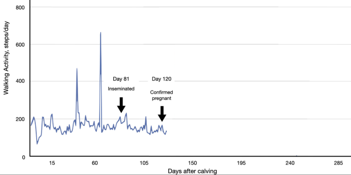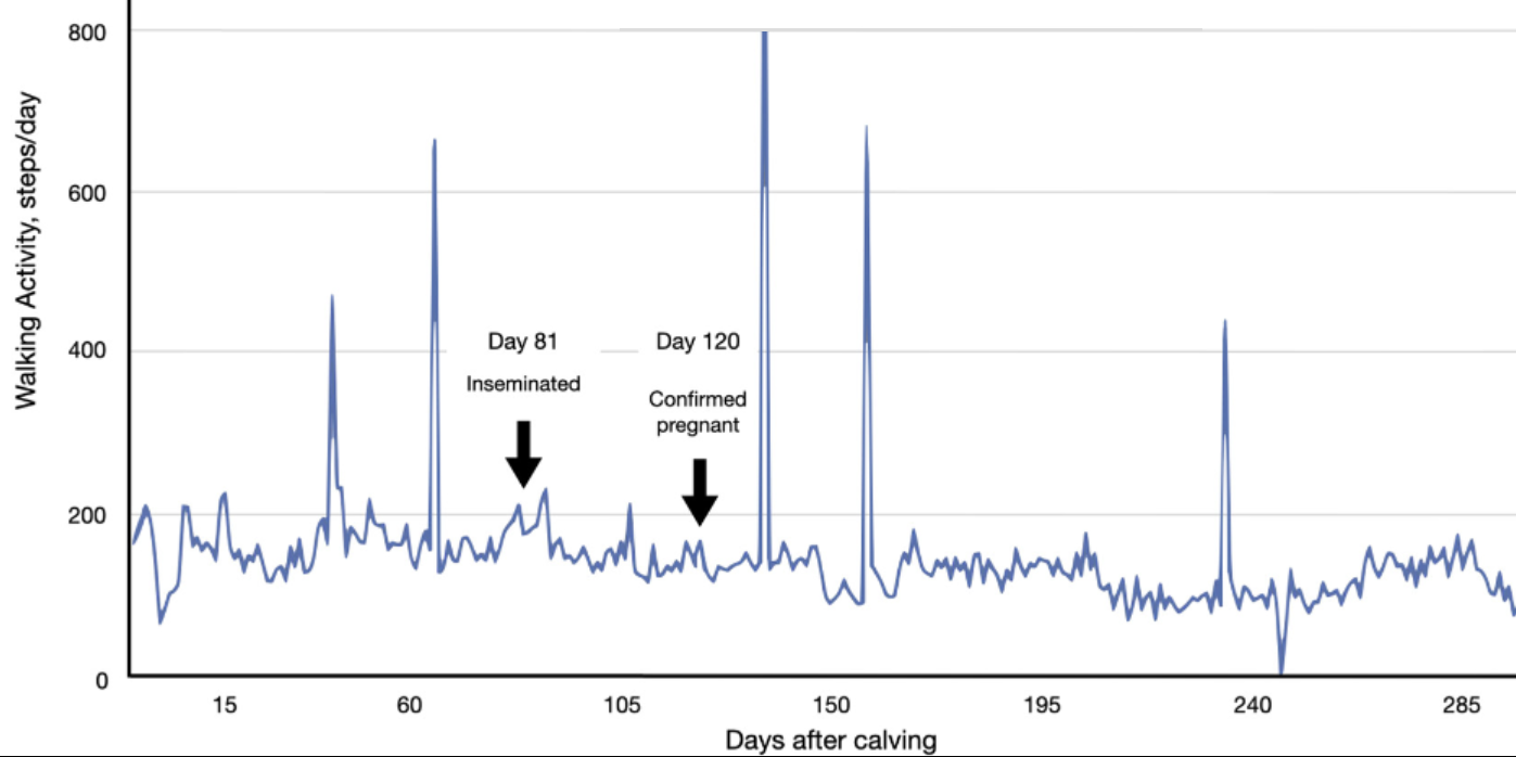 This study evaluates whether sudden increases in walking activity (activity peaks) detected by pedometers in pregnant dairy cows are indicative of pregnancy loss,. Analyzing data from 537 pregnancies, the authors determined that activity peaks frequently occur in pregnant cows and should not be misinterpreted as false estrous alerts or signs of abortion.