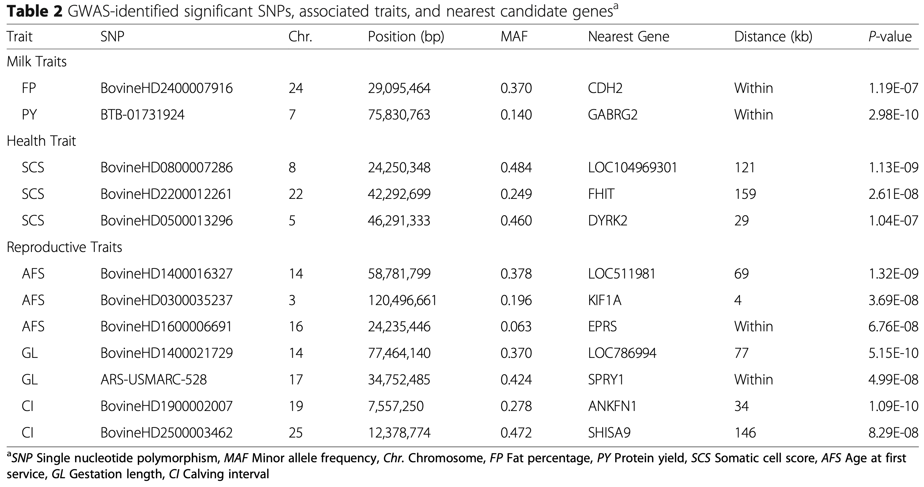 Analysis of the genomic regions surrounding significant SNPs revealed several promising candidate genes with biological functions relevant to the traits. For example, the CDH2 gene on chromosome 24, known to participate in adipogenesis, was linked to milk fat percentage, while the GABRG2 gene on chromosome 7 was associated with milk protein yield, offering potential targets for marker-assisted selection.