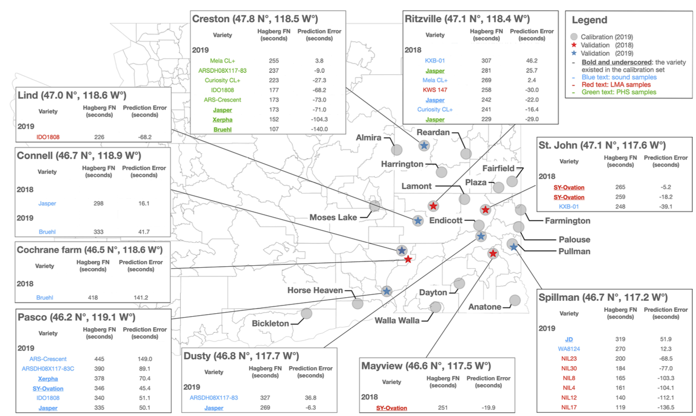 To ensure the prediction model is transferable across different environments rather than just a single homogeneous trial, the study utilized an independent validation dataset collected from 10 distinct locations across Washington State (e.g., Creston, Ritzville, Pasco) over two years. The figure illustrates the geographic distribution of these samples, which covered 19 different wheat varieties and various low-HFN conditions (such as LMA and PHS), allowing researchers to rigorously test the model's performance on data it had never seen before.