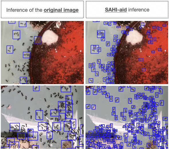Standard object detection models often fail to identify minute organisms in high-resolution images because the objects disappear during the feature map downsampling process. This figure visually demonstrates the transformative impact of SAHI in these dense scenarios: while inference on the full-scale image fails to detect the colony, the slicing-aided approach effectively divides the image into patches to 'zoom in', allowing the model to accurately localize and count hundreds of tiny ants that were previously undetectable.
