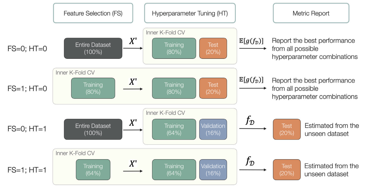 The study demonstrates how improper splitting strategies during model selection, such as performing feature selection or hyperparameter tuning on the entire dataset rather than within training folds, lead to significant data leakage and inflated performance estimates. This figure visualizes these distinct workflows (e.g., separating training, validation, and test sets versus mixing them), highlighting the necessity of isolating the model selection process from the final performance evaluation to ensure validity.
