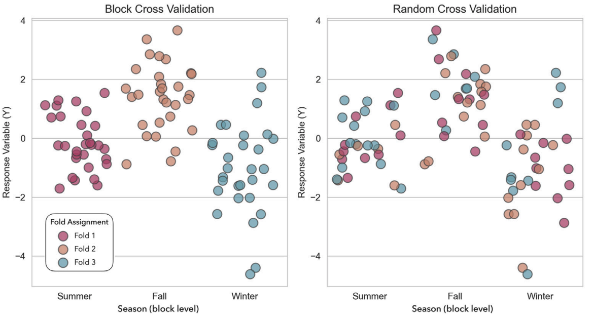 To rigorously quantify model estimation biases in a global setting, the study utilized both a simulated spectral dataset with controlled latent variables and a real-world forage quality dataset collected across multiple seasons. It illustrates the structure of the real-world dataset, characterized by complex seasonal variations and autocorrelation, which served as the foundation for benchmarking how well different evaluation strategies handle environmental block effects.